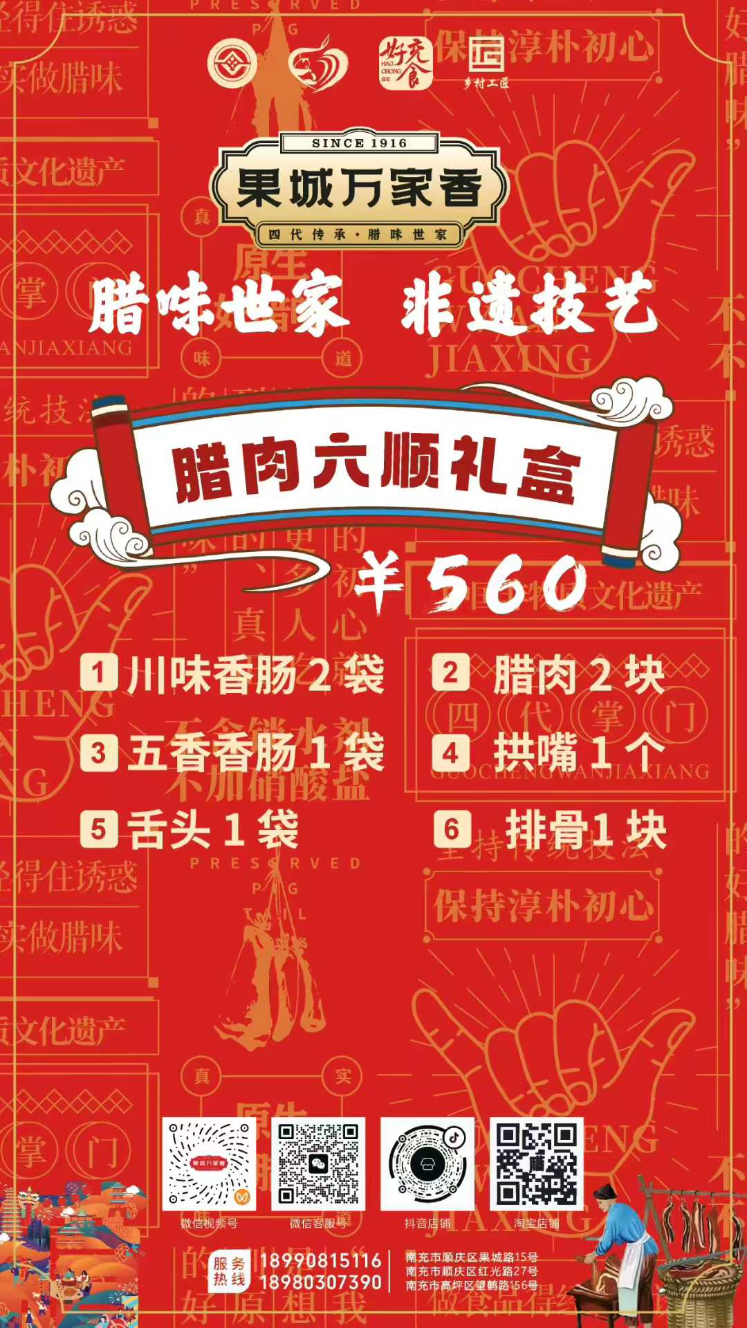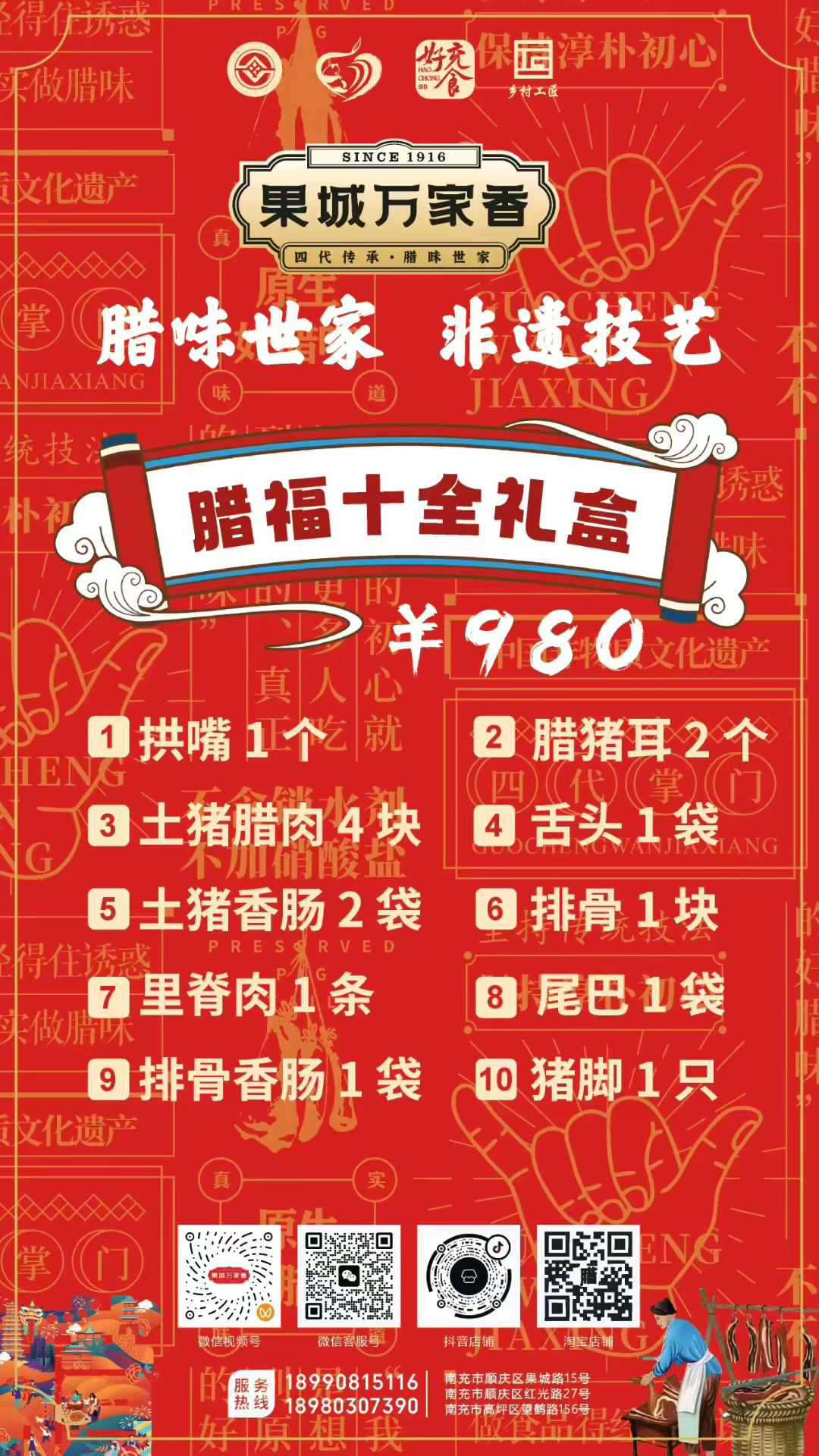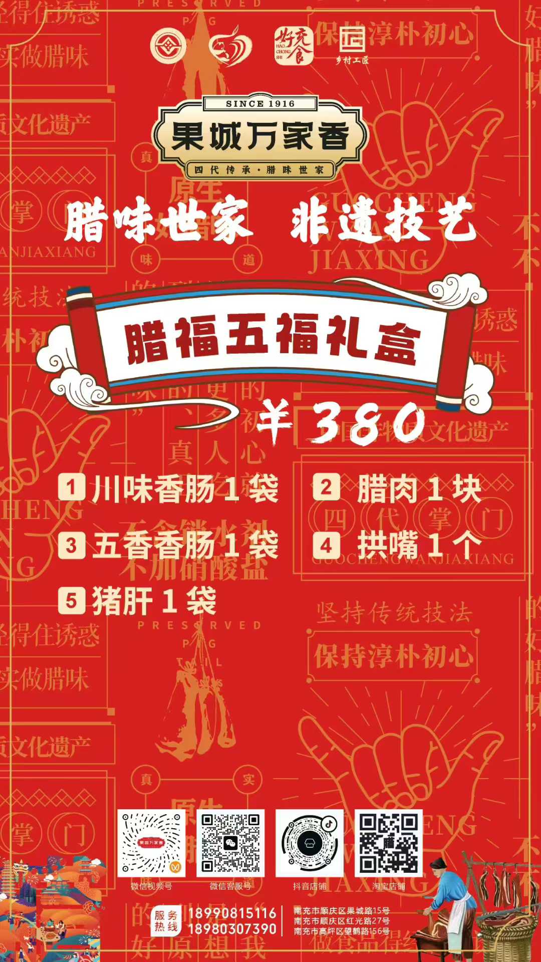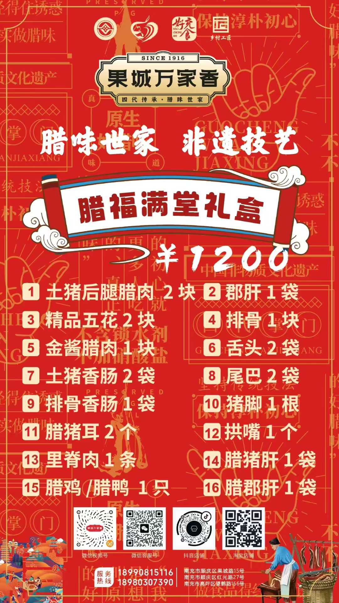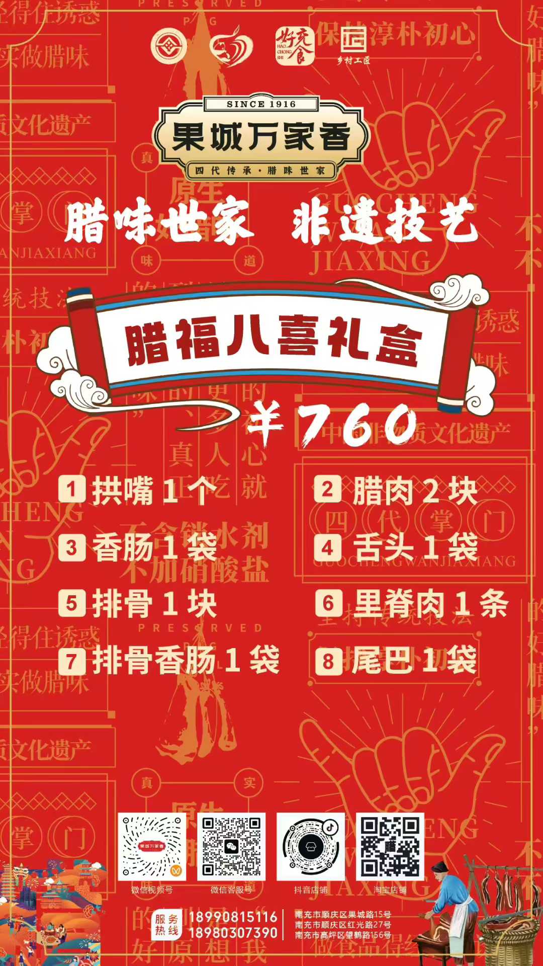 為滿足消費者多樣化的節日需求,萬家香特別推出了臘福五福、臘肉六順、臘福八吉、臘福十全、臘福滿堂等多款禮盒,從380元到1200元不等,涵蓋臘肉、香腸、拱嘴、豬耳等十余種臘味單品,無論是家庭團聚還是走親訪友,都能找到稱心之選。